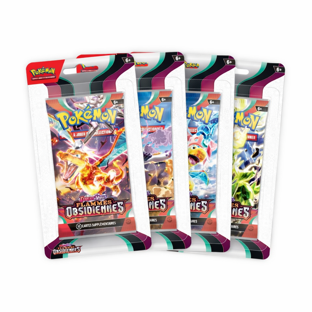 Artset sous blister composé des quatres illustrations de l'extension Flammes Obsidiennes.